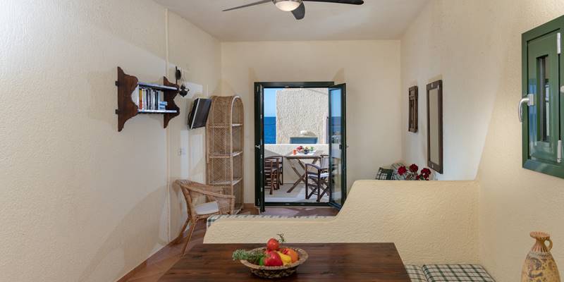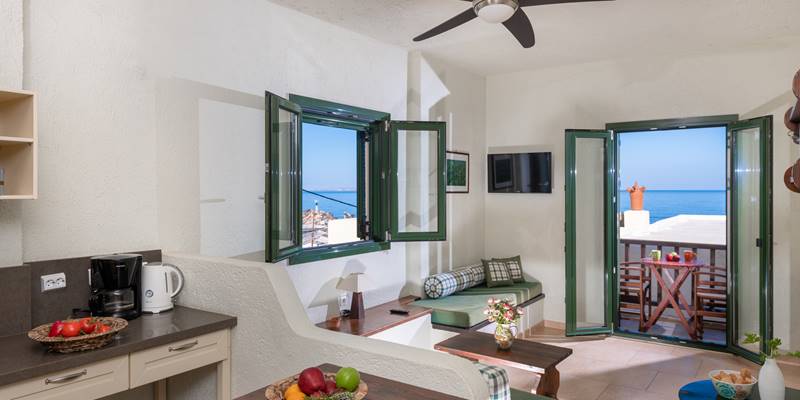 Diese Wohnungen sind identisch, wie die Superior mit Gartenblick, ausgestattet, und haben ein Balkon mit Meerblick dazu. Jede Wohnung (40m2) besteht aus einem Doppelzimmer. Diese Wohnungen sind für 2 Personnen geeignet.